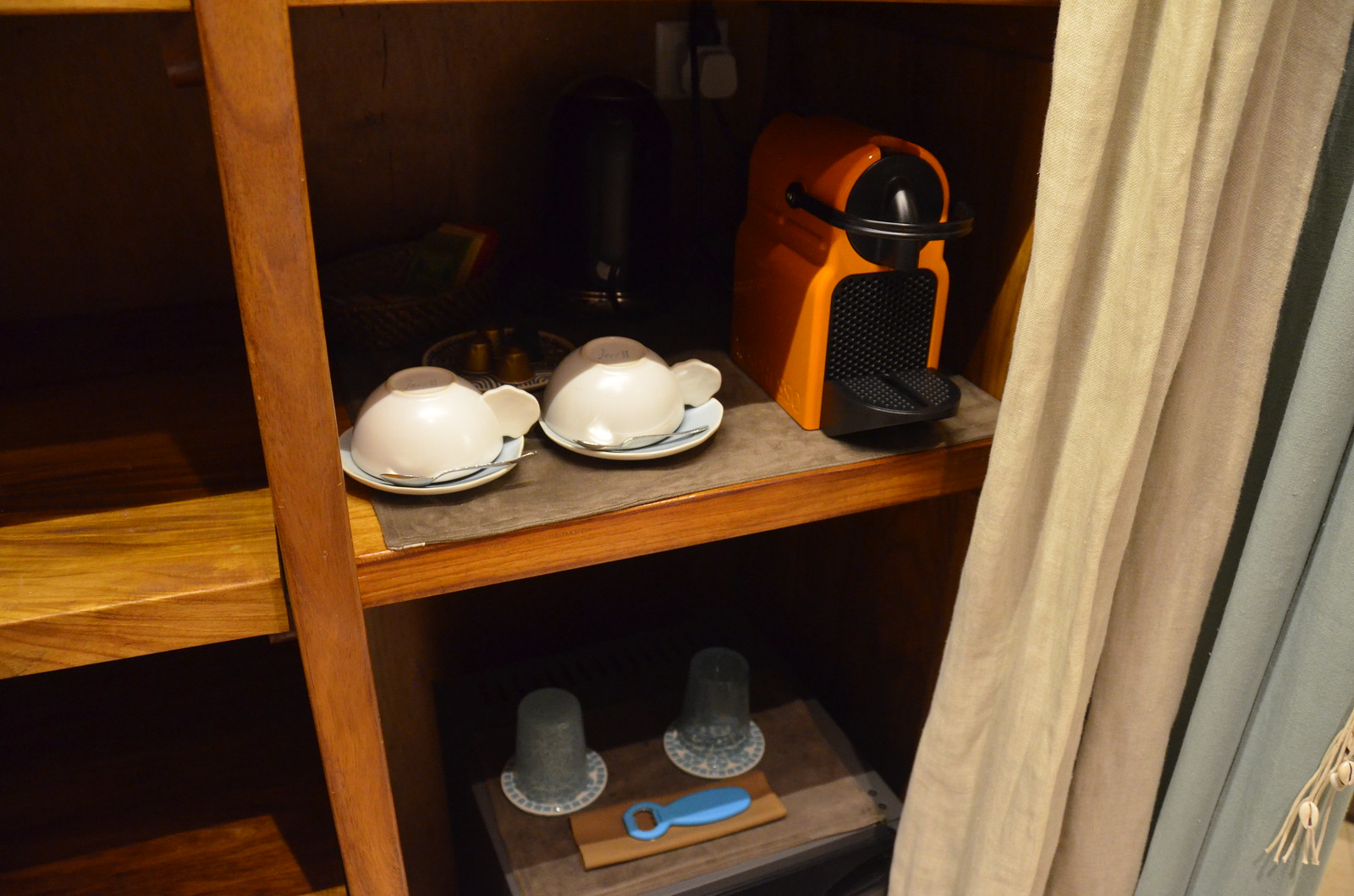 The storage space for the room was regular shelving behind fabric. It housed a small coffee maker that we never used. There were tiles and accessories on the fabric, making it very seaside-y. There was also a small mini bar (at charge).
