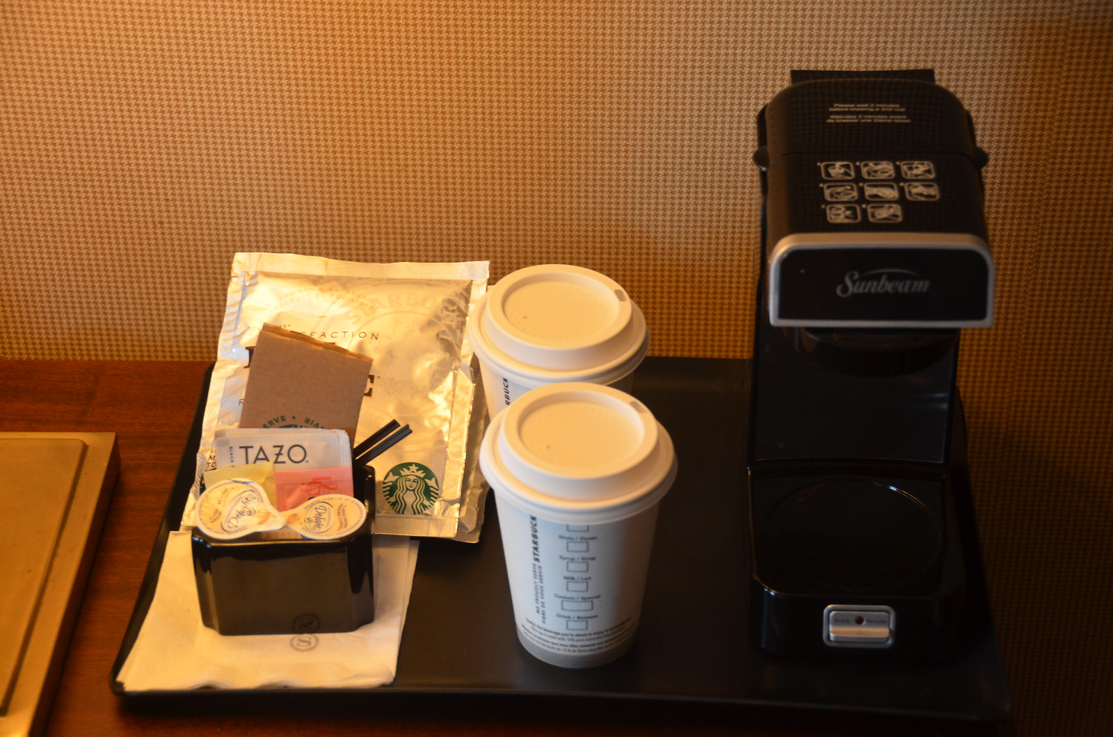 The room featured the usual instant coffeemakers with the take away cups. This version was the filtered Starbuck drip variety type along with Tazo teas.