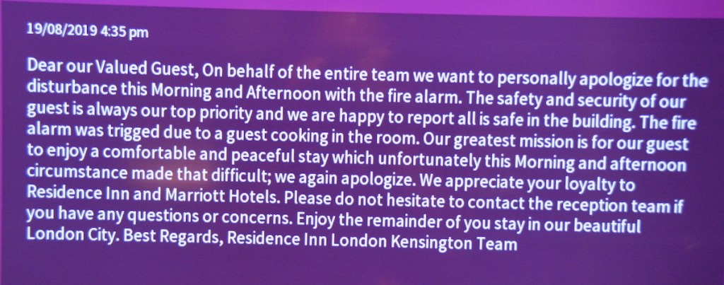 We headed home for the other half of the breaded chicken dinner and pasta, cooked on the HOB, in the comfort of our suite. We enjoyed it, along with some funny fire alarm messages.