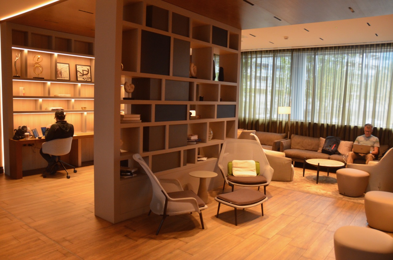Getting into the hotel itself, once you were past the entrance and lobby elevators. the lobby offered communal spaces along with coves for working. These spaces were frequently occupied on our visits.
