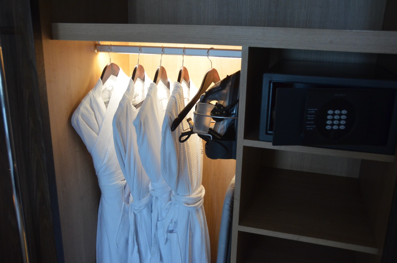 Along with the new construction of the hotel, it was a newer room. The room was set up for occupancy for four persons. As a result, there were four coffee cups, four robes and four sets of towels.