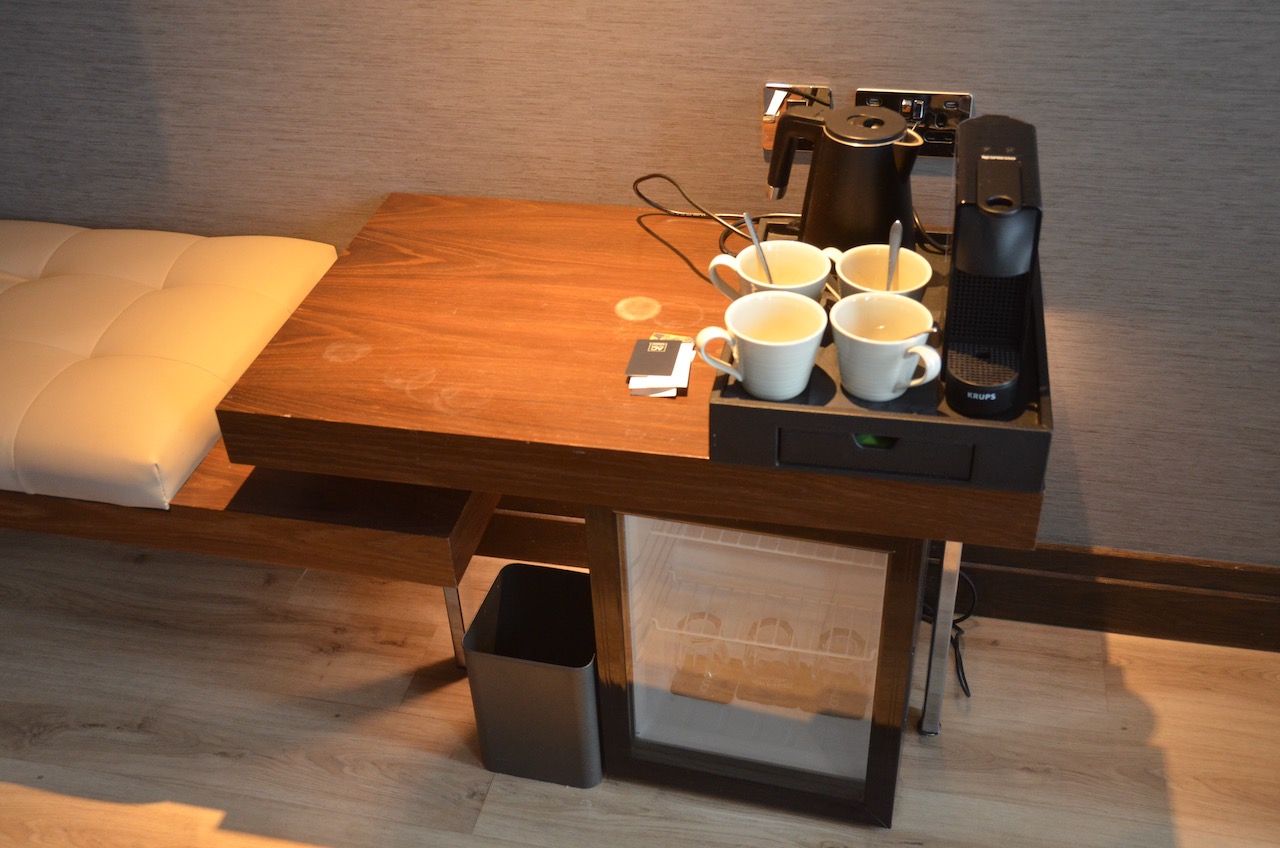 On the in room luggage stand, there was a tea and coffee service, with service for four persons.