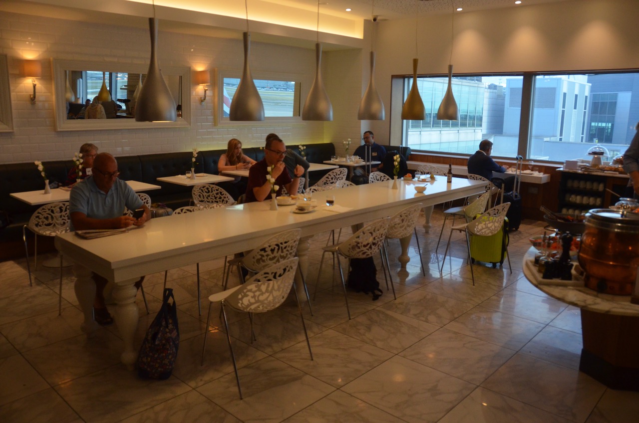 Our visit to the No1 Lounge London Heathrow had us in the busiest lounge of travels. The lounge seating area occupied some British looking couches of stuffed British leather upholstered goodness against windows. Instead of lounges that typically offer individual leather chairs, most of the seating was communal and shared.