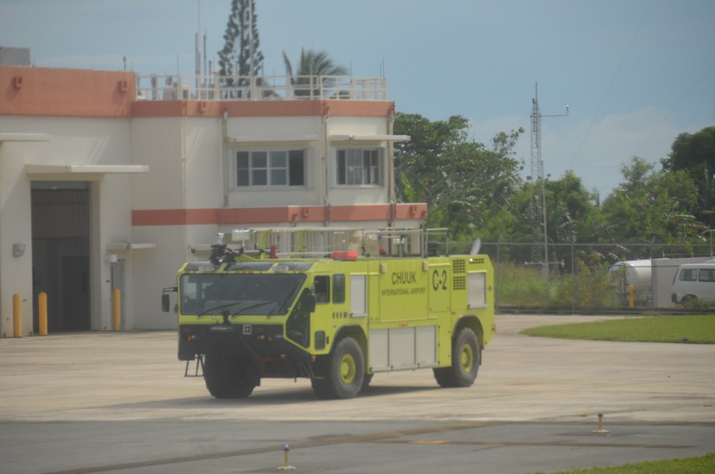 We landed on runway 4 and had a taxi to the terminal. As for the last time today, the Chuuk fire truck came out to meet us.