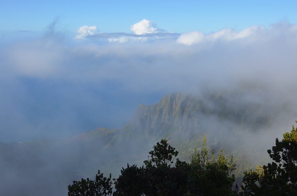 Unfortunately, the view of the Napali Coast that is on many postcards from here was totally obscured with cloud due to weather. We waited a bit here but we were timed out with no change in the cloud situation.