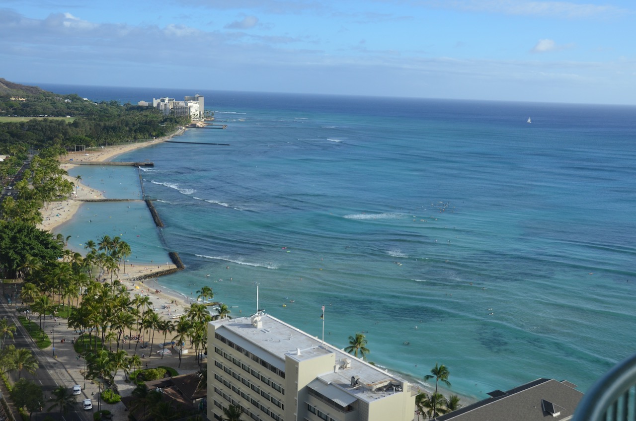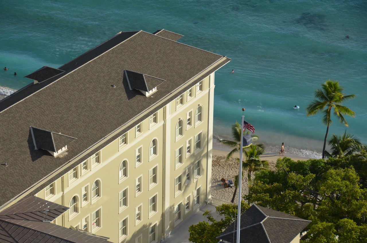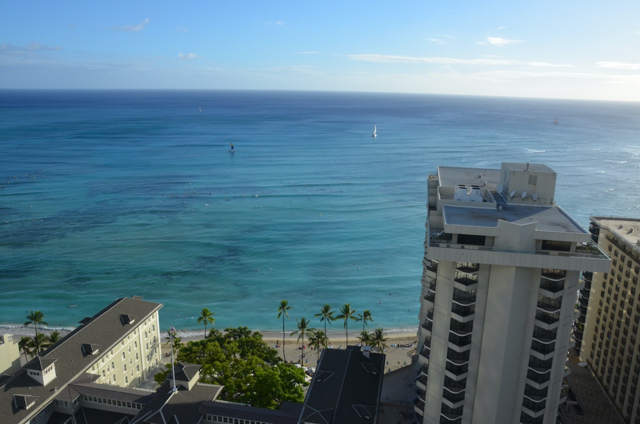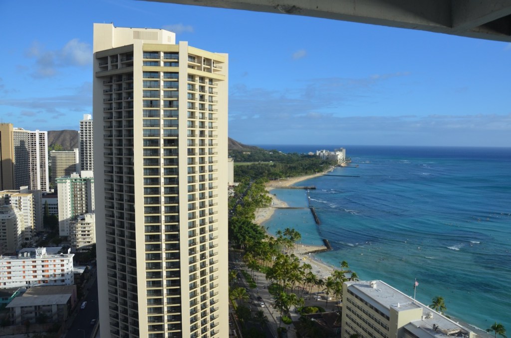 The views were of the Moana Surfrider, the Hyatt Regency next door and from the corner of the balcony, stretched up towards the Sheraton Waikiki and the Royal Hawaiian.