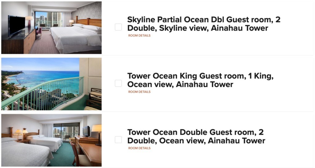The Sheraton Princess Kaiulani offered many categories of rooms in the upgrade pool. As with other hotels, there were several rooms listed in the Suite Night Award category that did not include “suites”.