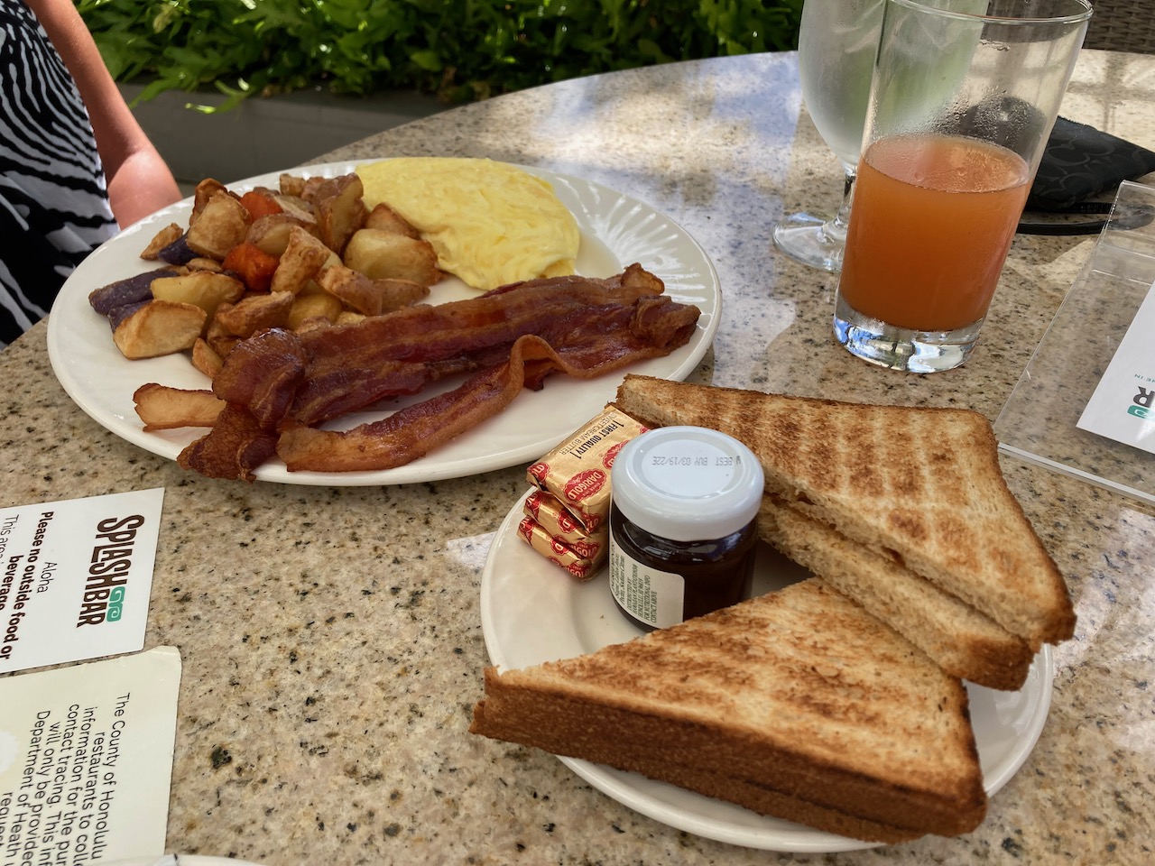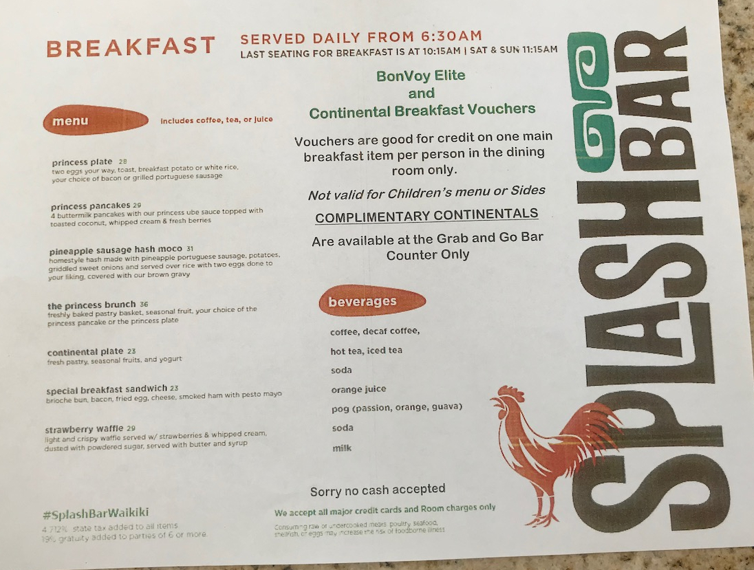 After we had experienced the continental breakfast on our hotel lanai, we enjoyed an a – la – carte breakfast at the Splash Bar on the outdoor patio. The environment was pleasant to enjoy breakfast outside, which is something I always look forward to when visiting Hawaii.