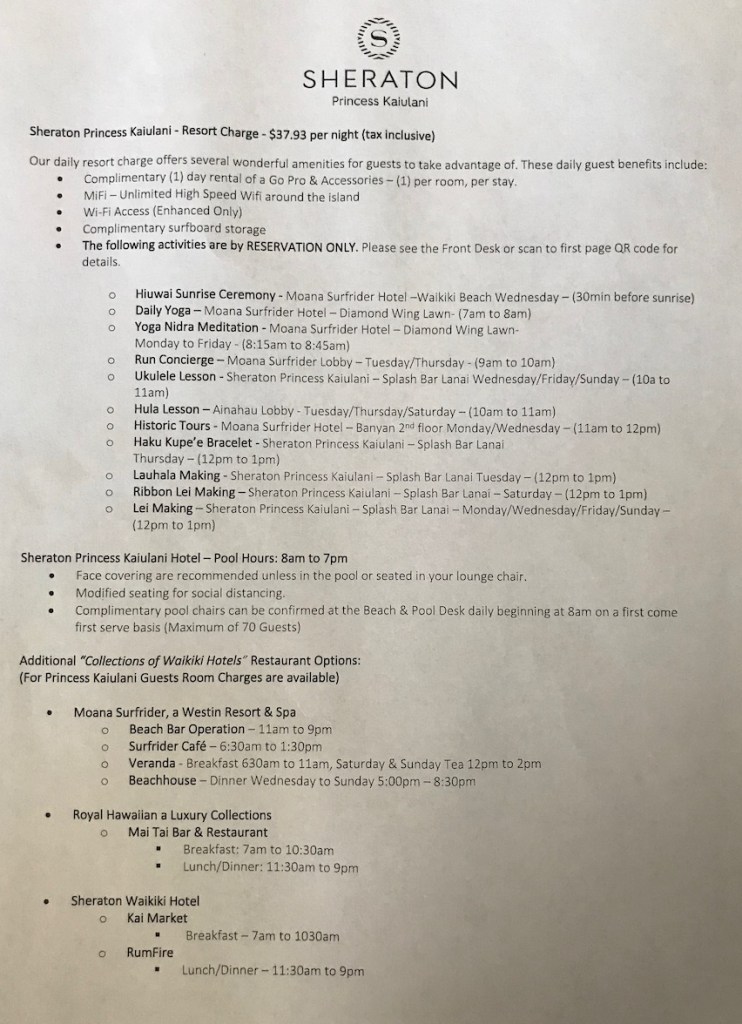 Like many of our other experiences, we didn’t get much (if any) use out of the features of the resort fee. The resort fee’s inclusions included wifi, a go pro loaner, several by reservation classes of lei making, etc… Every time we stay at the Hawaiian properties, the value from the fee seems to get less and less with the fee itself getting higher and higher.