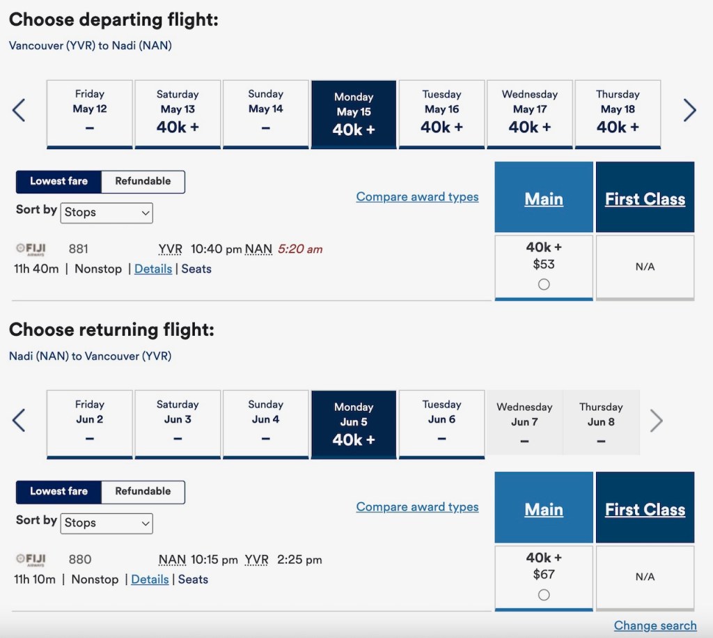 Unfortunately, I don’t see any business class award seats yet available. I have found with Fiji Airways that you really have to look well into the future (200+ days) as not a lot of business class seats are released into the reward inventory buckets for redemptions.