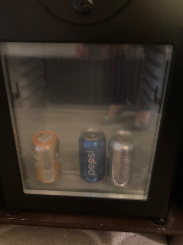 Under the television in the living room, there was a small minibar that only contained three items in it. There was no alcohol in the fridge. The fridge contained a Sprite, a Pepsi and a San Pellingrino that was chargeable at $4 USD per drink.