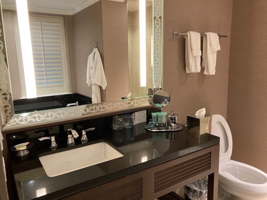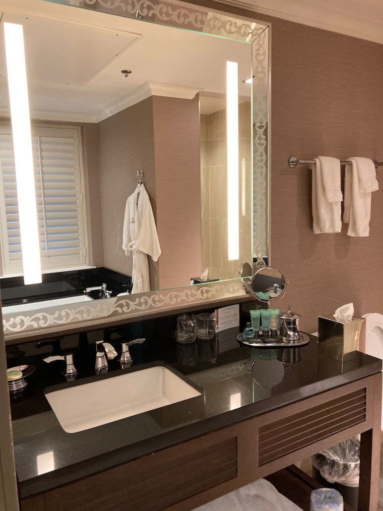 The bathroom was very spacious and bright. The fact that there was a make up mirror was an added bonus. The shower was medium to high pressure with a large shower head. I also appreciated that there were robes and large format towels.