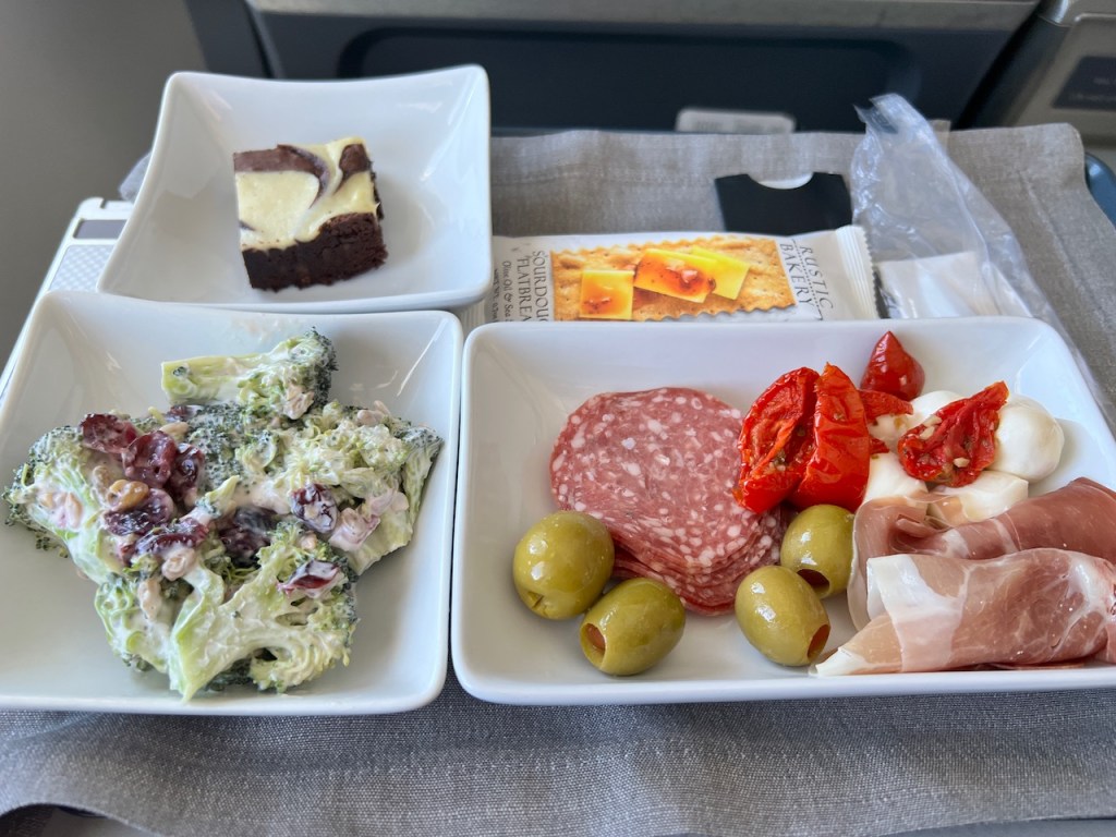 The meal choices for today were a pretzel sandwich with hummus, spinach or a charcuterie plate. With us being seated in row 3, they were already out of the sandwich by the time they got to us, so we were “stuck” with the charcuterie plate with apologies as they only loaded “5” sandwiches.
