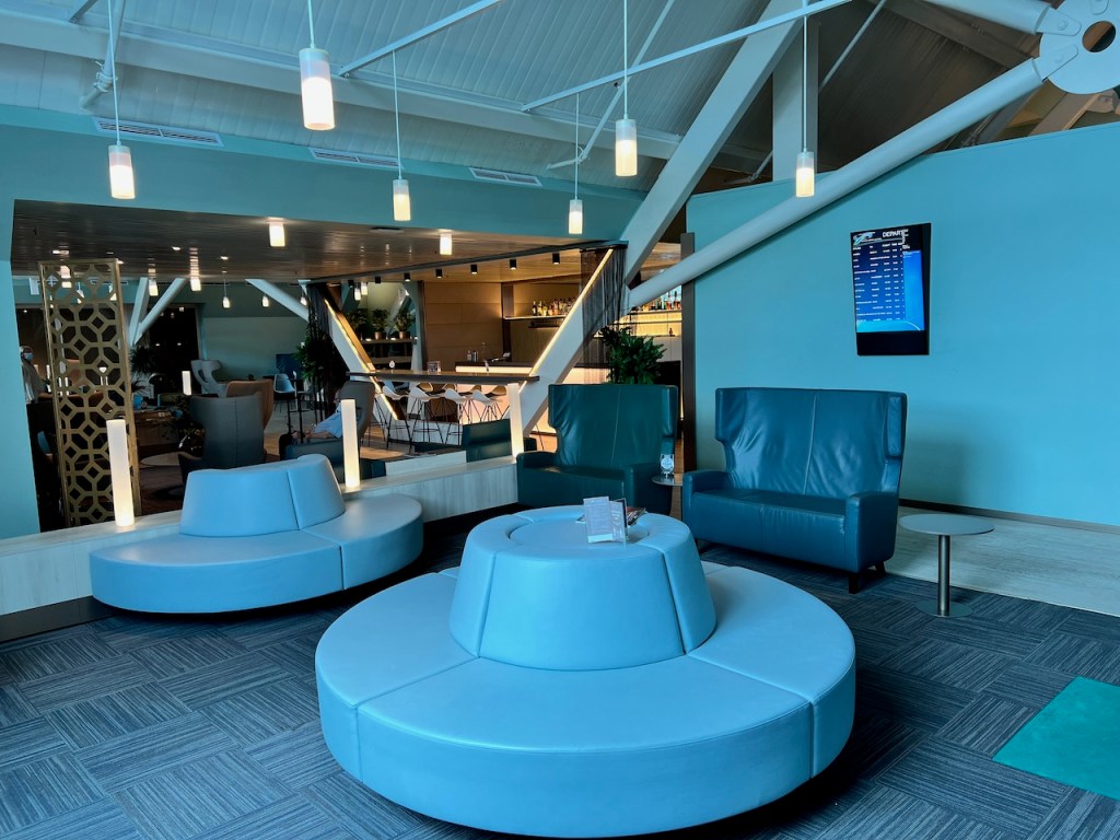 The lounge has been recently renovated with new paint and furniture. Just past reception immediately upon entering the lounge, was the primary seating area. It holds about thirty passengers in comfortable lounge chairs. The space was marked with high ceilings along with day light windows that led in a fair amount of light.