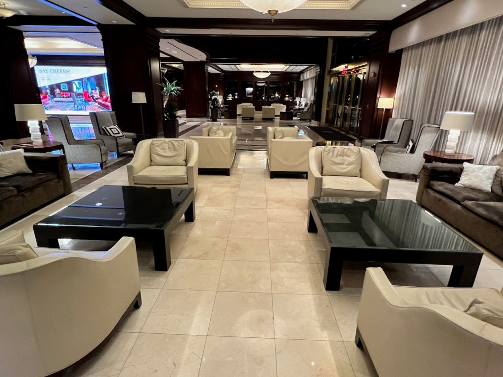 We rode up the short elevator to the lobby level which was one level up from ground floor. The lobby has an old man’s library feel to it and is decorated in dark mahogany browns accented with white leather furniture. It provides an upscale but not all to memorable lobby setting.