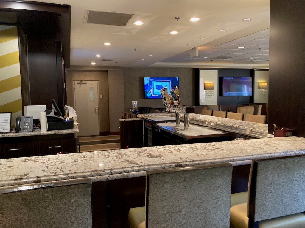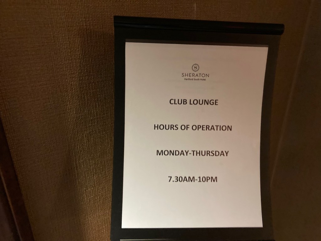 The Sheraton Hartford South offered a Sheraton Club Lounge. The lounge was closed for food service on our visit. The lounge was open but it only contained a mini fridge of small bottled waters.