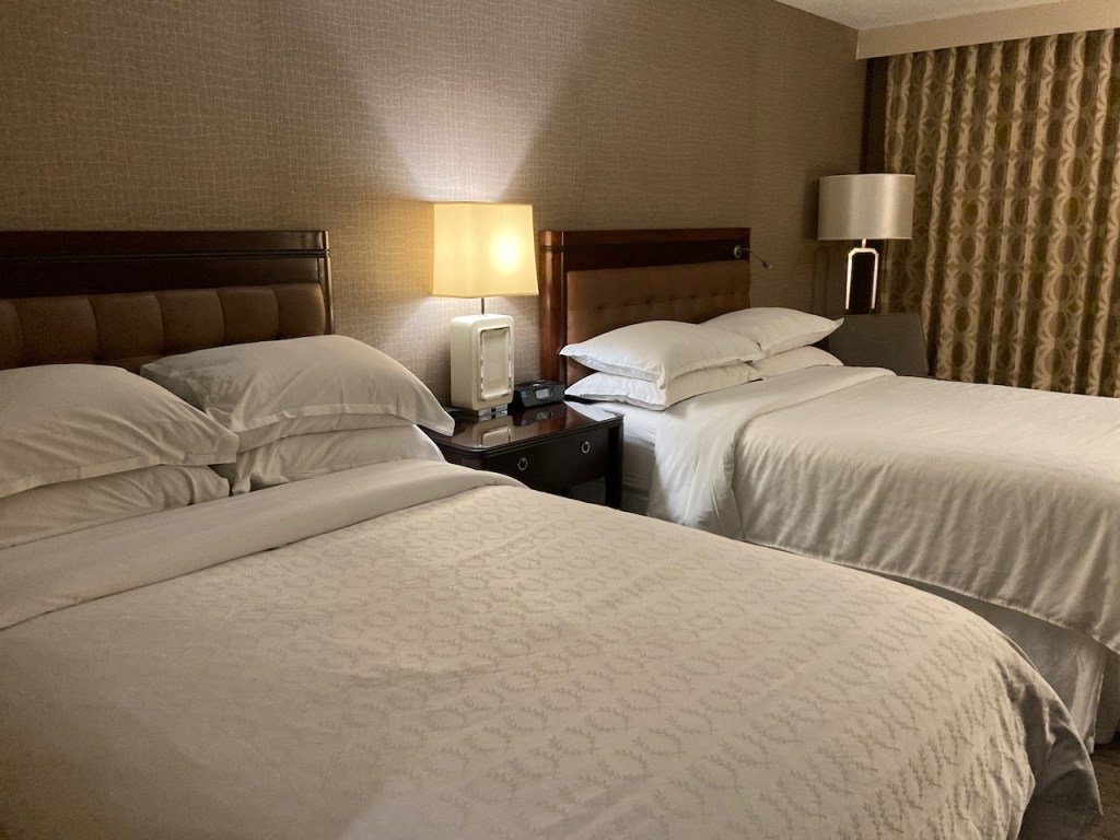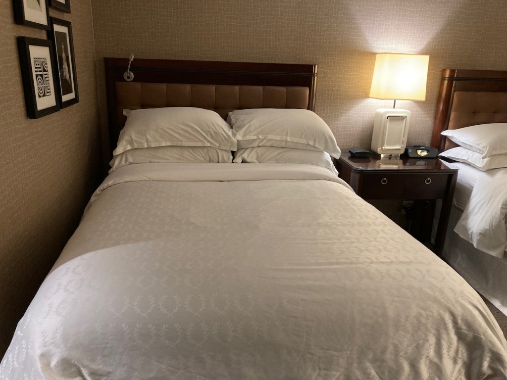 The room was decorated in the standard Sheraton beiges. While I didn’t book two double rooms, I didn’t mind having the extra space in order to stretch out for organizing my bags and other business stuff.