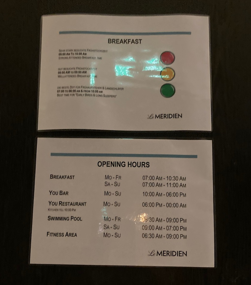 Surprisingly, the Le Meridien Vienna featured a posting of when the busy hours of breakfast were anticipated to be. The hotel also offered breakfast until 10:30 AM, with service up to 11:00 AM on weekends; something that is always appreciated for time zone affected travellers like myself.