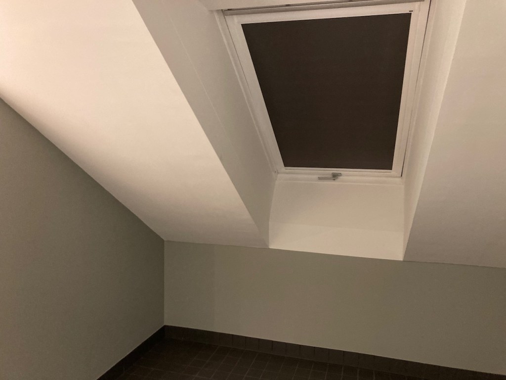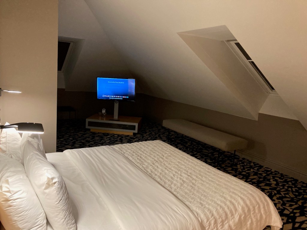 Working my way into the room, there was a sloping ceiling with skylight windows. This slope led to the king size bedroom area.