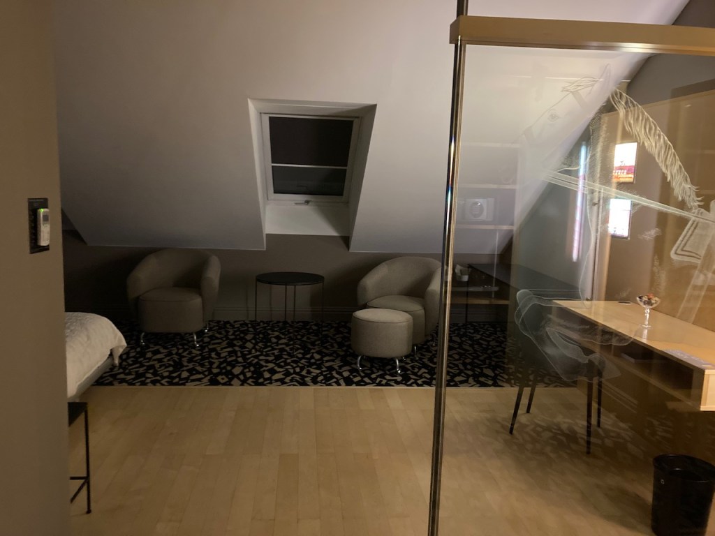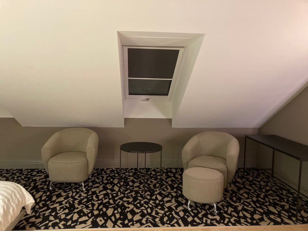 The main part of the room then led into the bedroom area that was up against a sloping roof. A workspace was found immediately on the right hand side of the room, followed by a two person occasional chair seating space.
