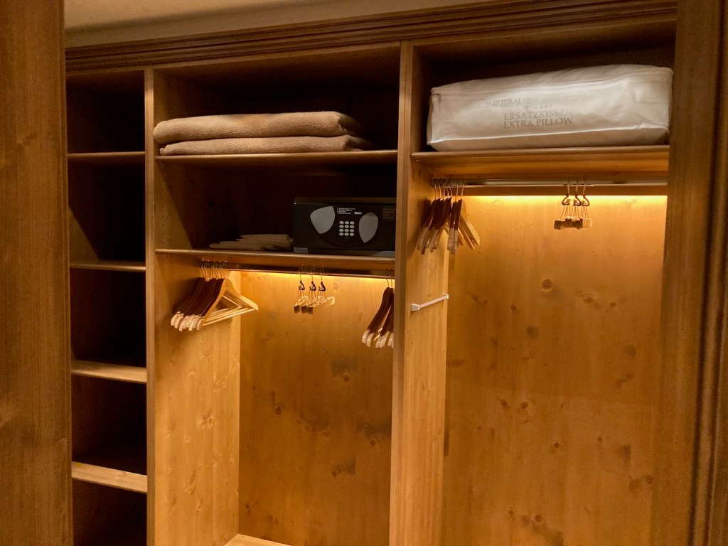Towards the front of the room, there were able storage areas for outdoor clothing. These storage spaces were integrated into the wall. It also contained the hotel’s in room safe.