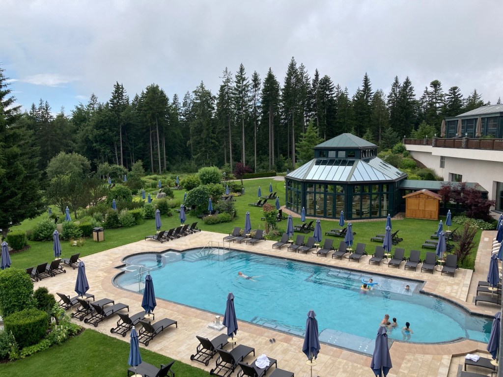 On a lower level, the hotel offered an outdoor pool and lawn area. The pool made for a beautiful setting for a swim. Despite visiting in July, I didn’t find the area to be all to warm. As a result, I would consider the outdoor space to be an “alpine” swim.