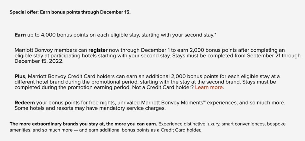 - Marriott Bonvoy can register now through December 1, 2022 to earn 2,000 bonus points after completing an eligible stay at participating hotels starting with your second stay.