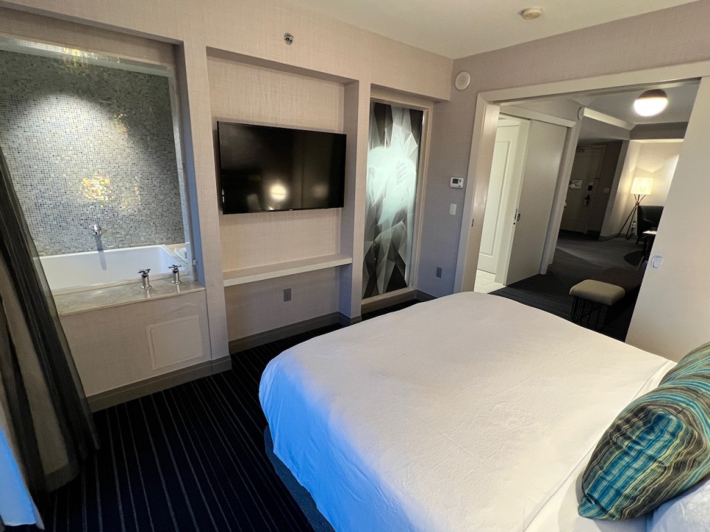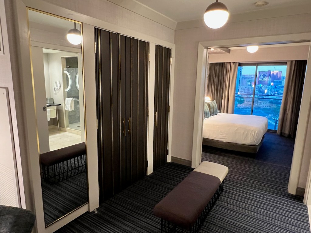 The bedroom was straight ahead and located closest to the suite windows. It was a little compact, but well placed right up against the windows to the fountain views outside.