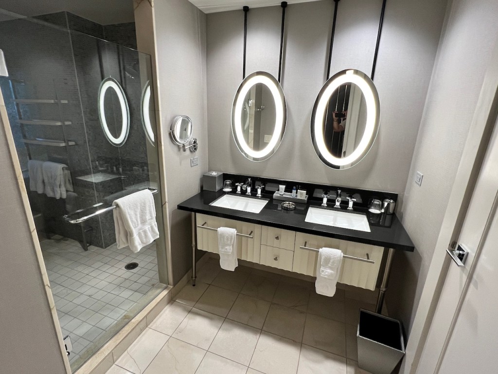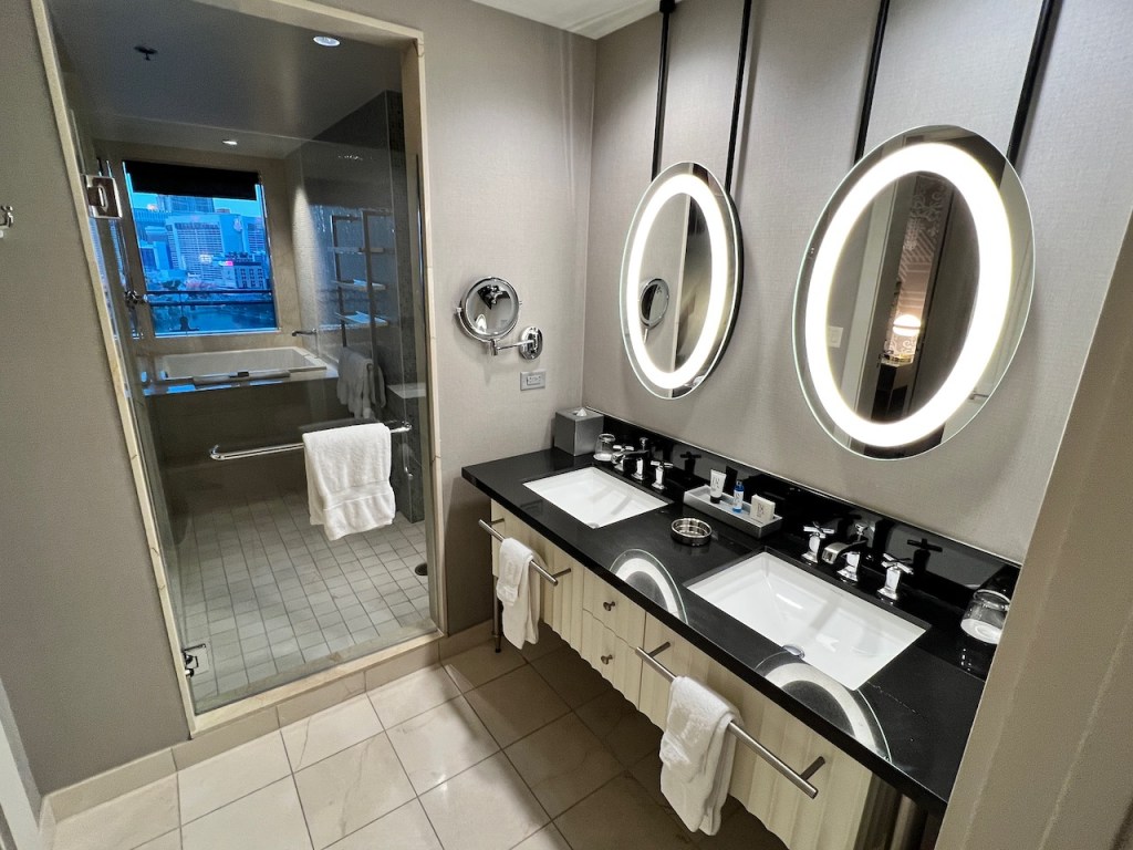 The bathroom was separated into three spaces; a WC, a double vanity area and a hot tub. Starting with the bathroom area, a double vanity sink was offered. The sink area itself was a little compact for two, but it was still appreciated to have twice the space than a single sink.