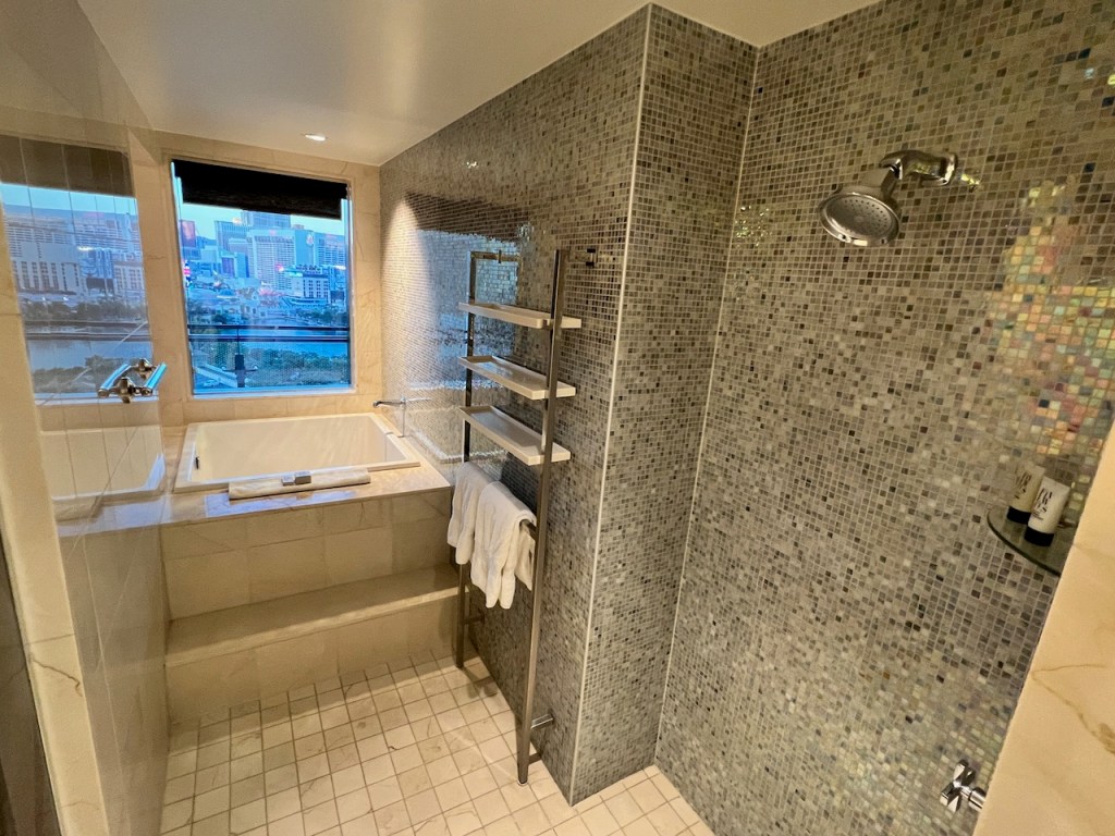 The shower area offered a room with a large roomy stand up shower. The shower space led to a deep Japanese tub, with a feature window that offered strip views.