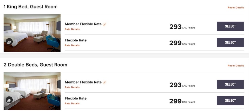 I booked my usual standard 1 King Bed, Guest Room for approximately 209 CAD ($150 USD) on my last 4 night stay. I booked through the Marriott Bonvoy website, which as a Marriott Titanium Member, entitled me to a complimentary upgrade to the best available room, including select suites, complimentary access to the Sheraton Club Lounge, and a complimentary late check out up to 4 PM.