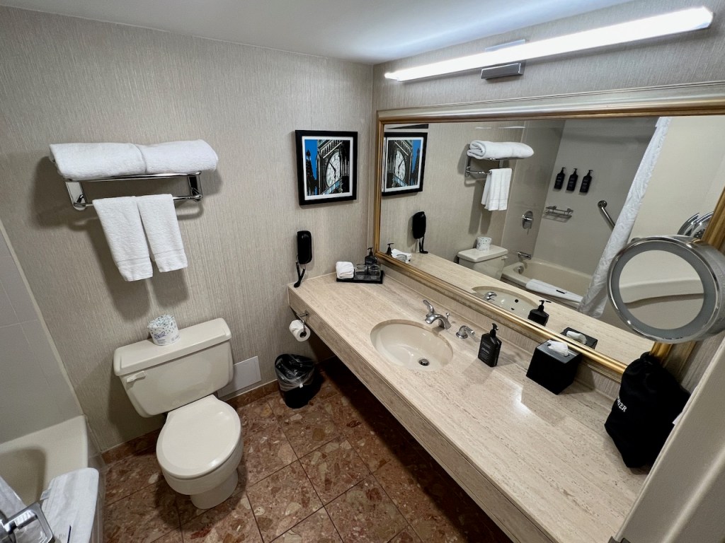 Probably the weakest part of the hotel room was the compact bathroom. As a result of the age of the hotel, consistent with the designs of that era, are that the bathrooms are a little on the small side. The bathroom is really set up for one traveller, with a single vanity sink and a compact combination shower and tub.