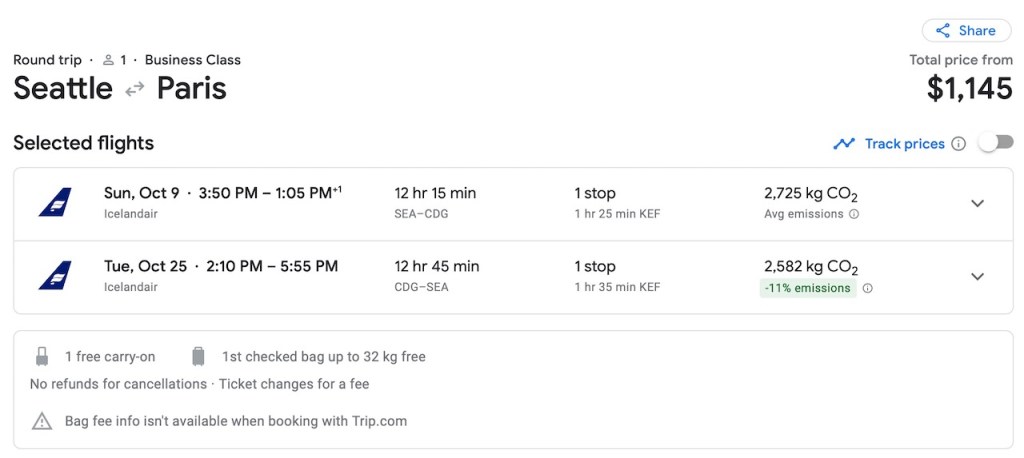 We booked Icelandair Saga Premium Business Class Seattle – Reykjavík, Icelandair Saga Premium Class Reykjavík – Paris and return Icelandair Saga Premium Business Class Paris – Reykjavík and connecting home to Icelandair Saga Premium Business Class Reykjavík – Seattle. These fares booked into “A” Class and allowed earning of 125% on Alaska Mileage Plan.