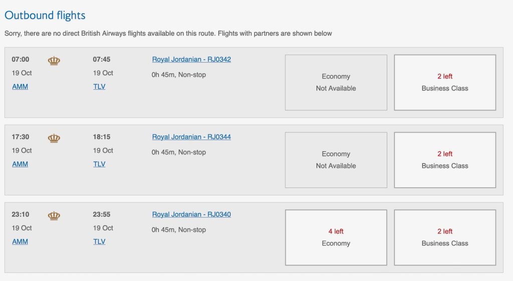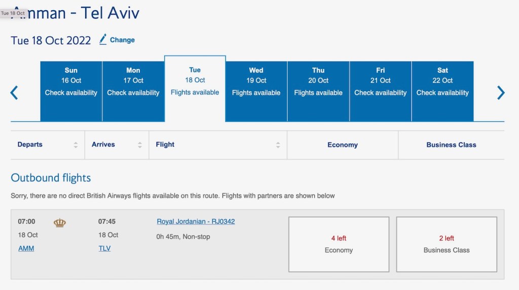 • Redemption: 12,000 British Airways Executive Club Avios Points (6000 X 2) for Royal Jordanian Business Class: Amman – Tel Aviv as a Marriott Bonvoy Titanium level member.