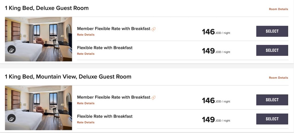 When booking at the Petra Marriott Hotel, I was able to get a regular Marriott Bonvoy Members rate of 146 JOD ($213 USD) for this property which booked into the basic 1 King Bed, Guest Room. I booked direct on the Marriott Bonvoy website. As a Marriott Bonvoy Titanium Level member, I would also be entitled to Upgrade to best available room, including select suites.