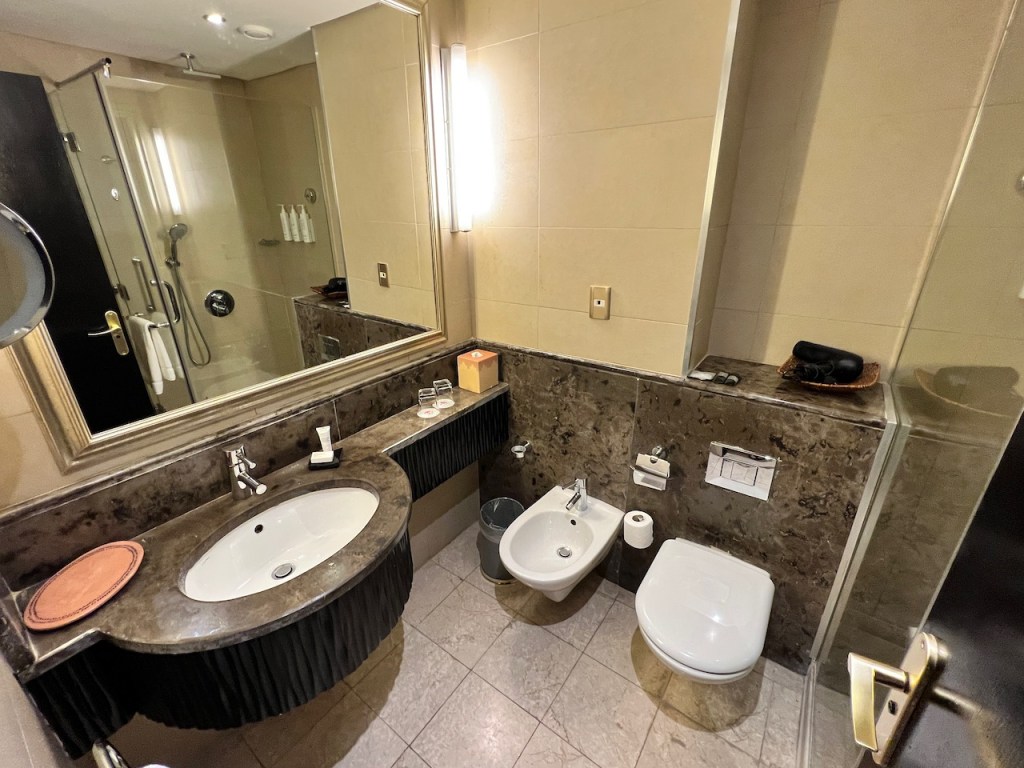The bathroom of the Premium Guest Room was a standard variety compact bathroom. It offered space for only one person with a single vanity sink. a toilet and a bidet. There was also a very compact shower, which in our case was a little leaky on the floor.
