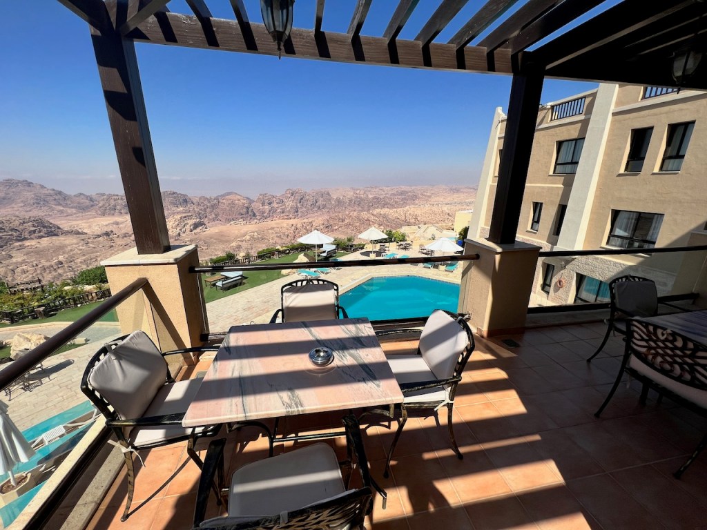 The Petra Marriott Hotel offers an outdoor pool and terrace. The terrace had a spectacular view over the mountains, along with some artificial grass.