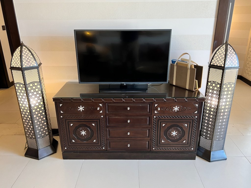 The living space had Arabian themed pictures and offered a comfortable sitting area inside the room. The living room offered two small tables, along with a smaller flat screen television anchored by a reasonably comfortable couch.