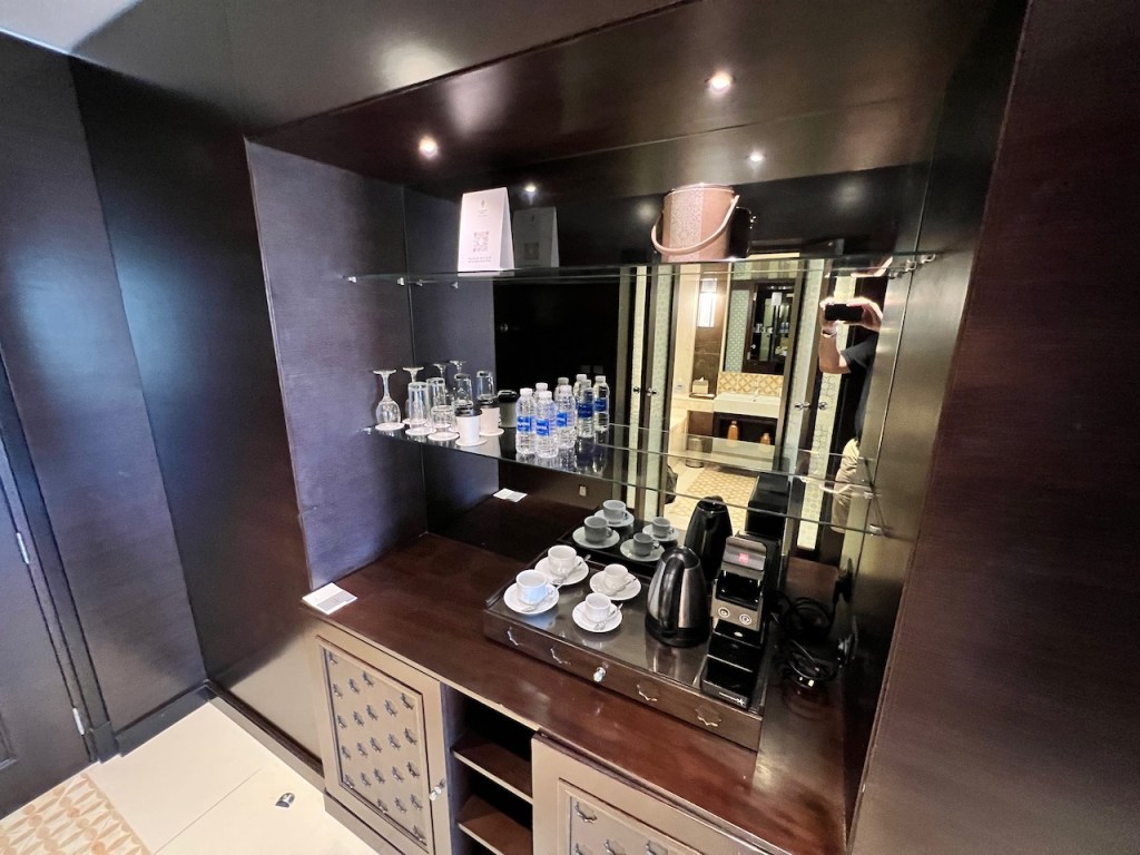 The hallway leading from the main door into the room served as the entertainment and room amenities hallway. It contained a full series of glassware, a coffee maker, along with a mini fridge which was completely empty except for some bottled water.
