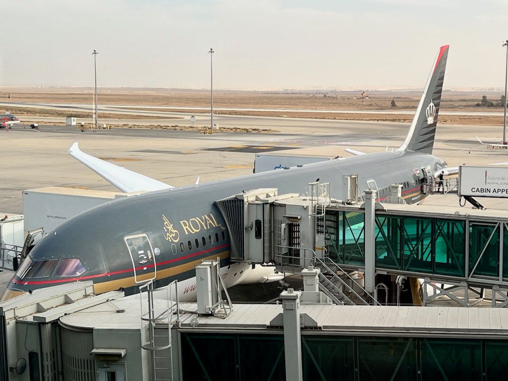 The sleek looking Royal Jordanian Boeing 787-8 was parked outside the gate. The Royal Jordanian black livery is among the most unique looking planes worldwide, and could almost be substituted for a private corporate aircraft if you removed the gold Royal Jordanian text across the fuselage.