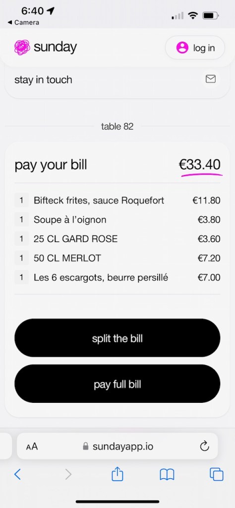 The cheque was presented digitally, saving the servers their time in running around trying to tabulate bills. The check for 3 courses, one half bottle and one glass of wine came to 33.40 € ($34 USD)