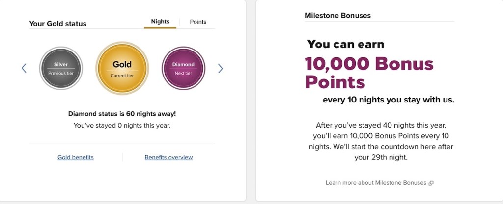 Hilton Honors Gold Level Status is available for those that regularly spend forty or more nights with Hilton. It is the next level tier above Hilton Honors Silver (ten nights), and underneath their top level Hilton Honors Diamond level (sixty nights).