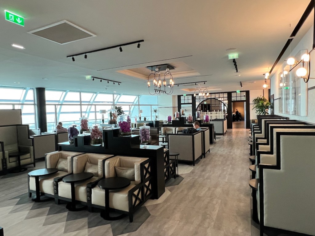 Continuing on into the main part of the lounge, the Extime Lounge offered a main seating space in a long rectangular room. The room had bright floor to ceiling windows, which made the space pleasant to relax in.