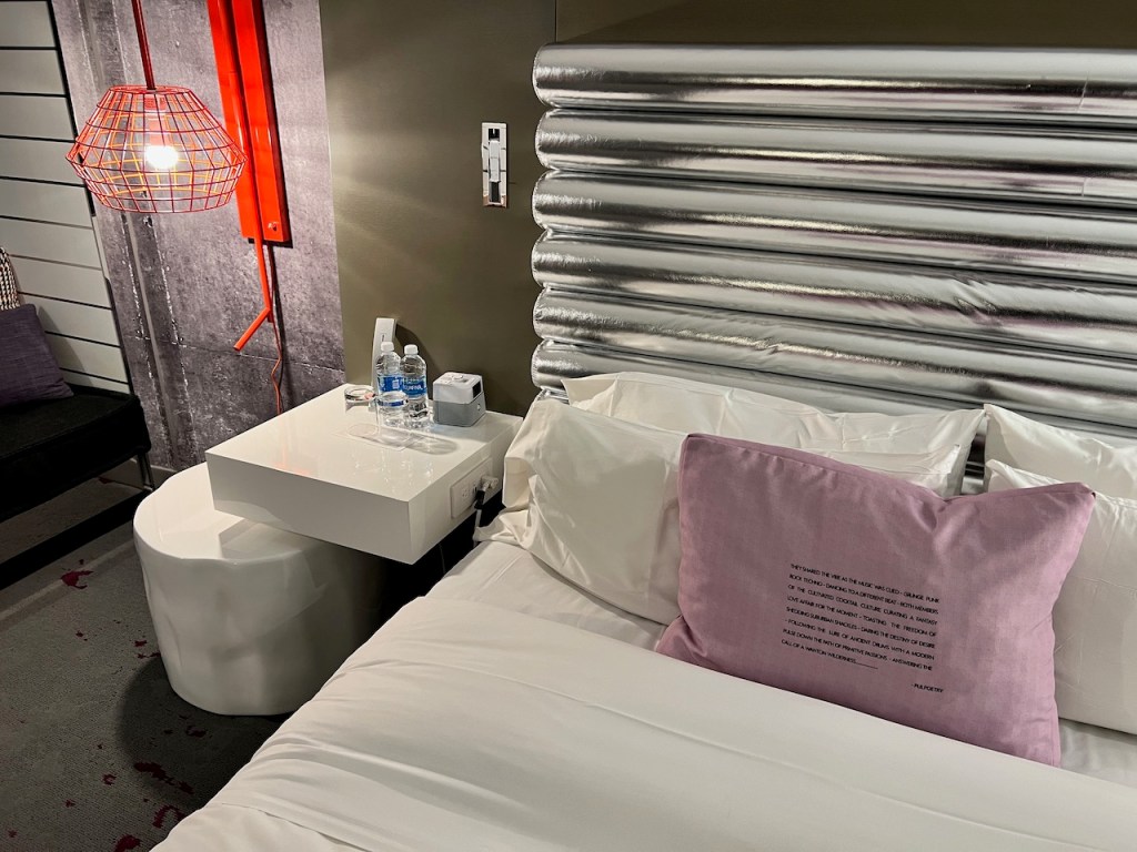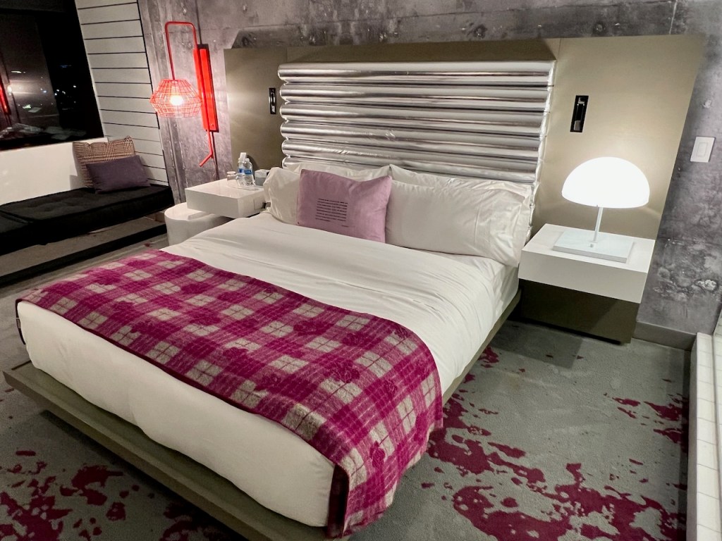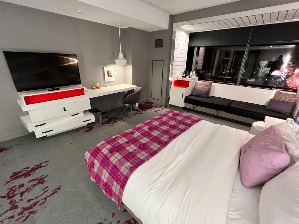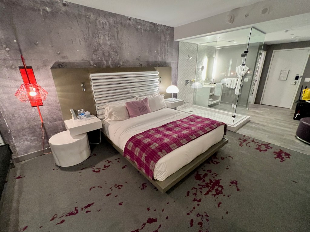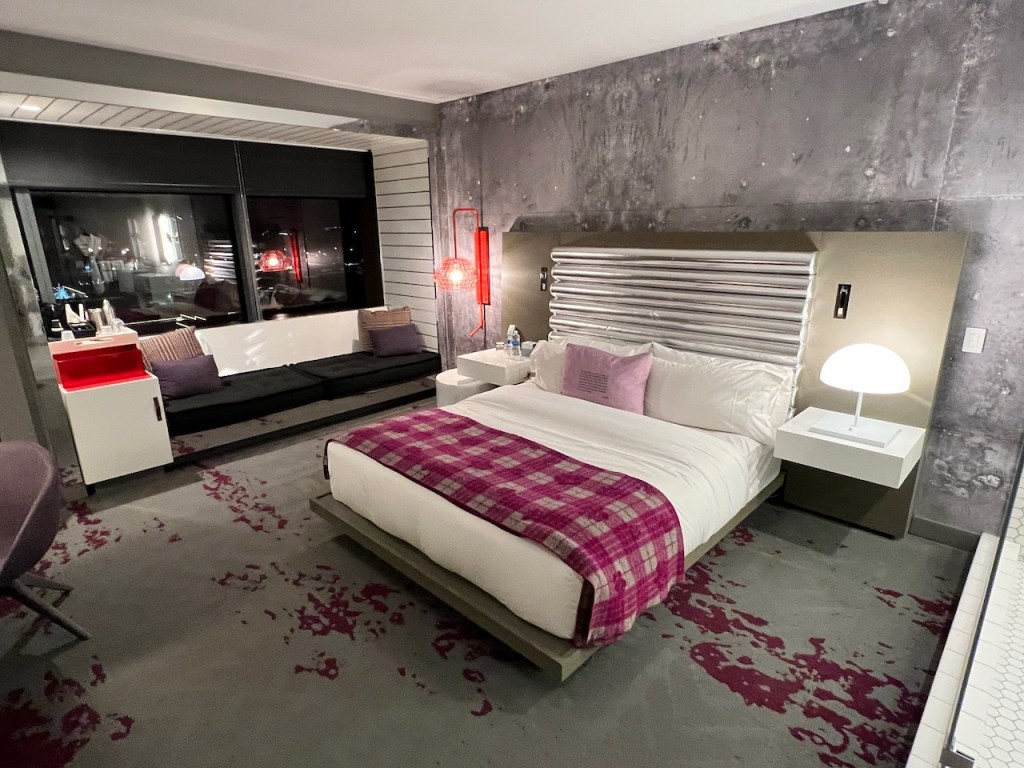 Moving into the bedroom, the Fabulous Guest Room offers standard W Hotels décor. The walls. are wallpaper concrete looking with pink purple accent tones. Urban lighting rounded out the space.