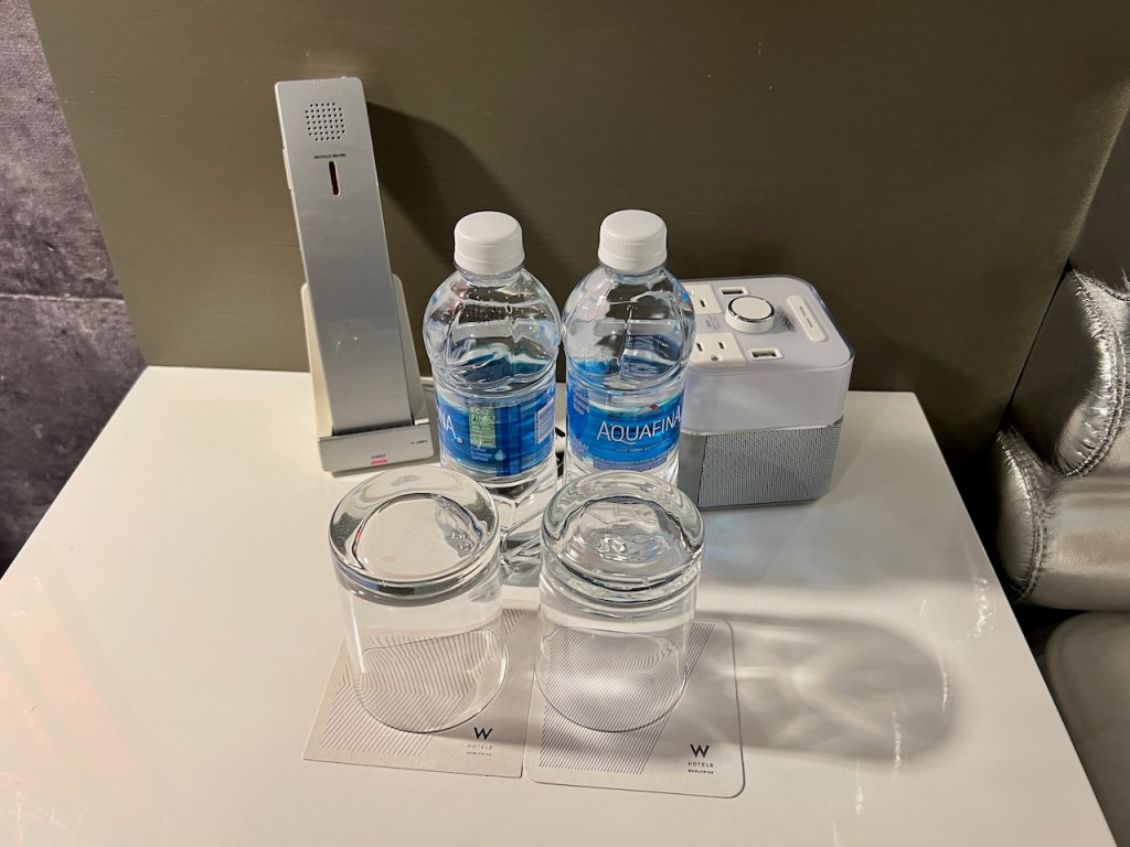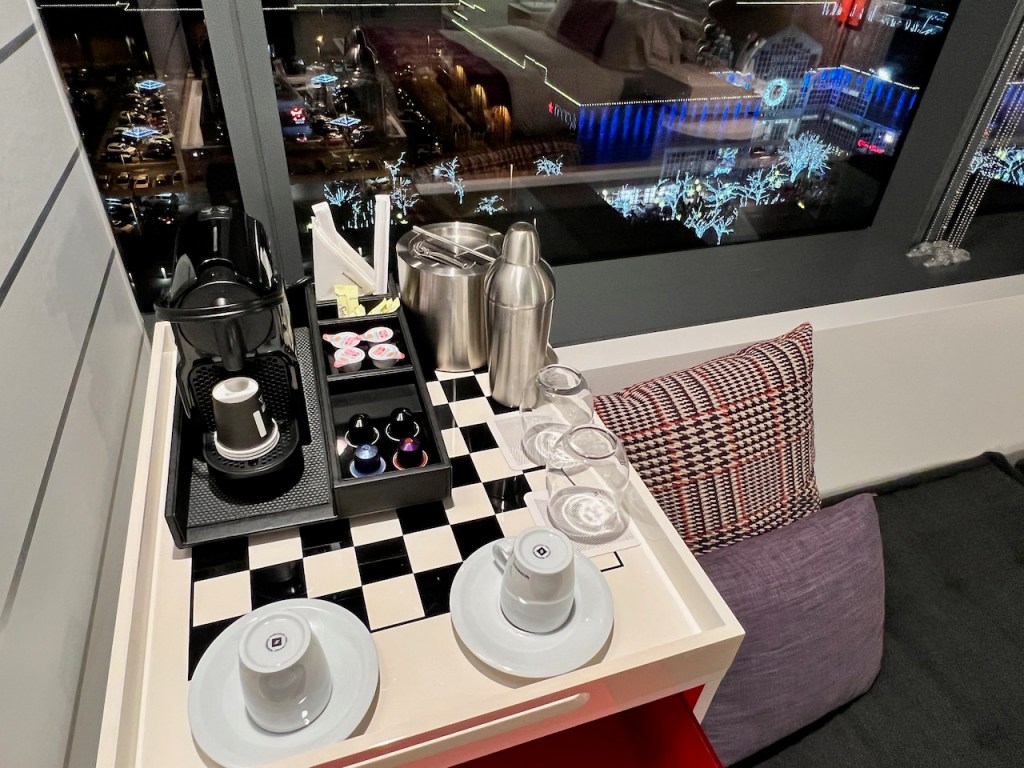 In true W hotels style, the room also featured proper glassware. In our case, the room offered a small bar next to a Nespresso Coffee Maker. A Martini Shaker was also present in the room, along with a stainless steel ice bucket.