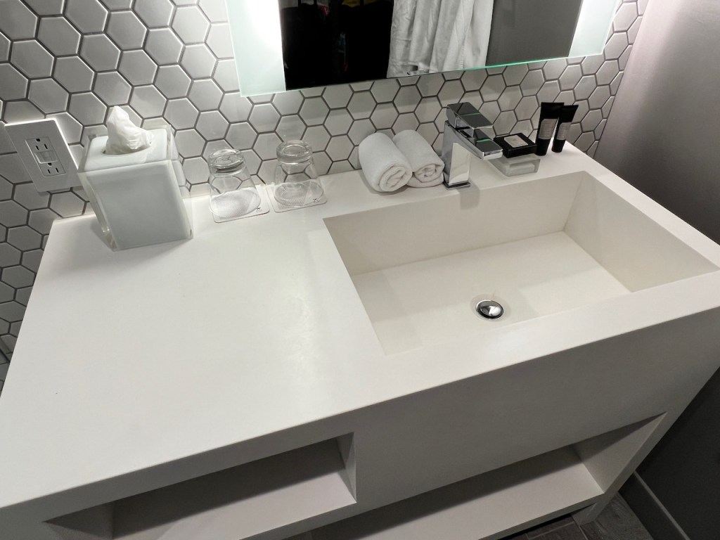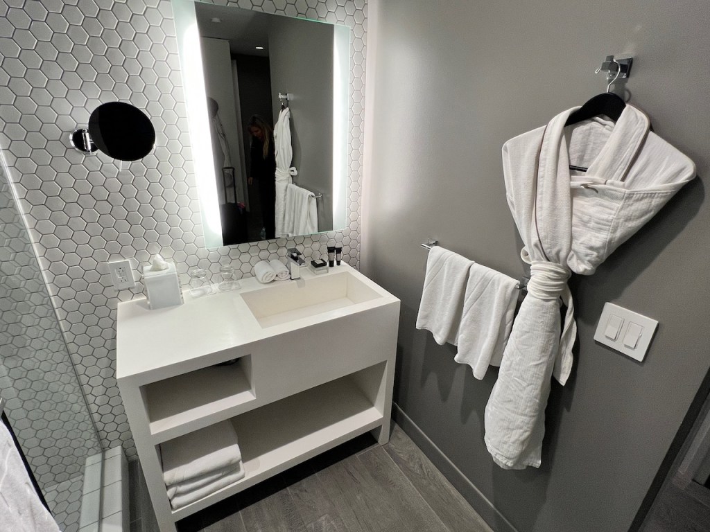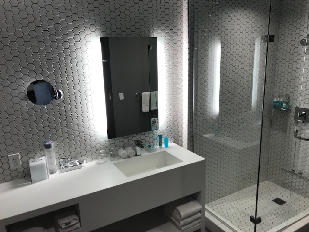 The W Bellevue Fabulous Room Bathroom offered a single vanity. As I mentioned earlier, privacy isn’t the bathroom’s strongest feature. Given the sink configuration, it was a little challenging to place toiletries bags for two as a result of limited surface space.