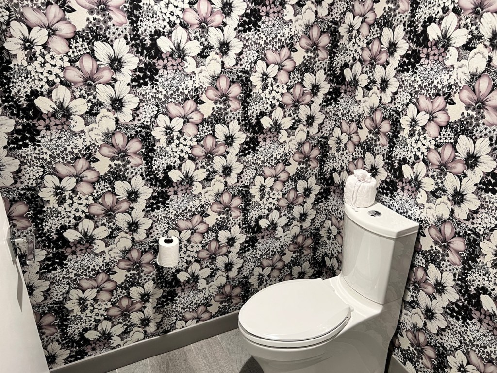 The bathroom did offer a private WC room, featuring a single toilet. The space was marked with bright wallpaper in a flowery pattern.