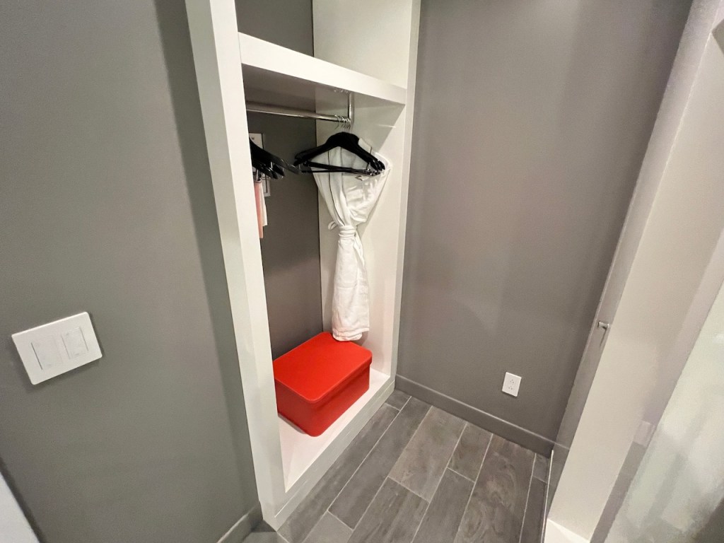 The room also featured an open closet in the foyer. Along with space to hang jackets and coats, the room featured two W white bathrobes.