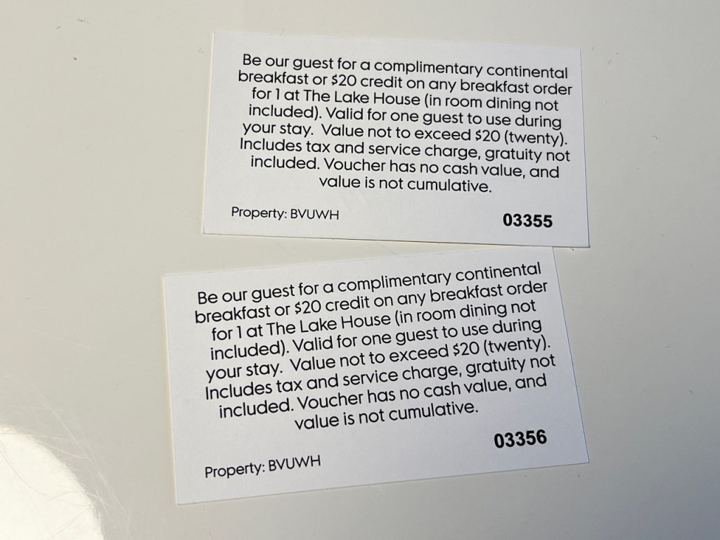 As a Marriott Bonvoy Elite welcome benefit, we opted for the breakfast benefit. We were provided a series of coupons for breakfast for two valued at $20 USD per person for the attached The Lakehouse Restaurant.