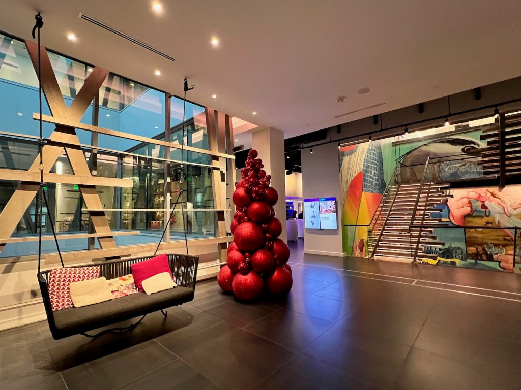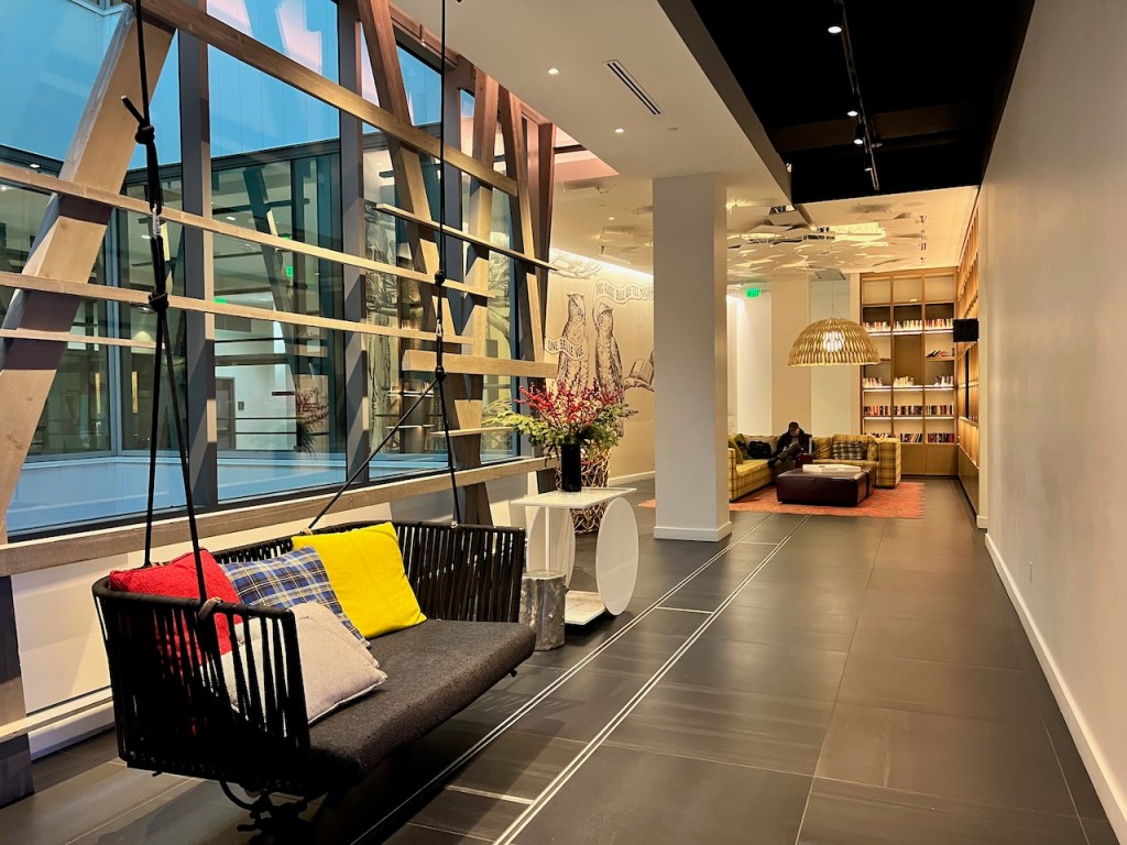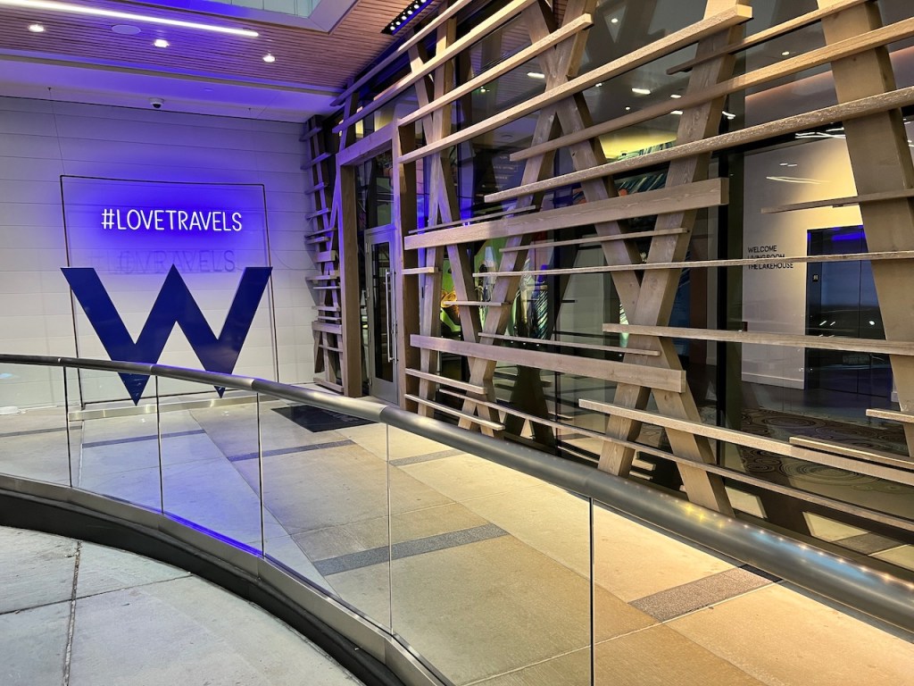 The lobby for the W Bellevue is actually on the second floor. Regardless of whether you arrive to the main loading area pictured above, or the underground parking garage, you’ll need to take an elevator up to the second floor to speak with hotel reception. As you arrive to the lobby level, you’ll pass by the open staircase between the three lower levels of the hotel.